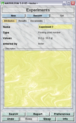 - Free: For experiments defined as "Free" anything can be typed in as a result. This of course gives a maximum of freedeom but makes it really difficult to handle the results later on. You should restrict this type to experiments where really noen of the other types is applicable.
