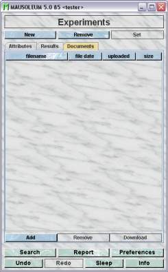 This tab lets you store and exchange documents like pdf- or Word-files with additional informations about the experiments of your group. In this tab you will find a list with the document which have been uploaded to the server.