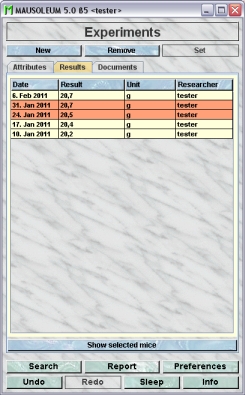 After you have defined experiments you can enter experimental results for your mice in a structured and searchable manner which makes further evaluation of your results easy. How to store and retrieve experimental results is descriibed here.