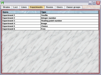 Only GURUs can add and remove experiments. To add a new mouse strain you click "Experiments" in the object selection field of the inspector. The table of experiments opens. In the Experiment-inspector you click the "New"-button. A dialog appears in which you can specify the attributes of the new experiment.