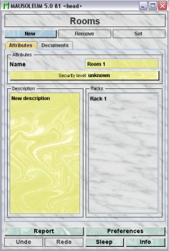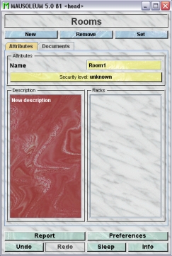 The first type of objects which have to be defined within the service unit are the rooms. You cannot define new racks without specifying in which room they are positioned. Also for the caretakers of the service group the room definitions are essential because their session are connected to one room of the service unit. That means that a service caretaker has to specify the room he or she will work.
