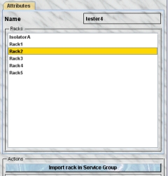 You first select the group in the group table. Then the racks of this group are listed in the group inspector. After selecting a rack which is not yet part of the service group (indicated by the missing [S] prefix) in the Racks field of the group inspector you will notice that the button Import rack in Service Group becomes active.
