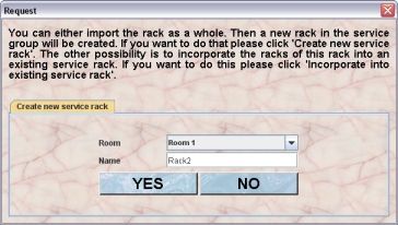 Clicking this button brings up a dialog which lets you choose the details of this import. There are two main options. The easy option is to import the rack as it is and put it into a room of the service unit. This option is always available in the tab Create new service rack in the dialog. Here you specify the room where the rack is located and you can also change the name of the rack and thereby apply the nomenclature guidelines of the service group.