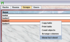 As head of the servcie group you can produce detailed reports for all the groups. These reports show the number of mice, cages and matings listed by rack, by room and by license. To get these reports you select in the group table the groups you are interested in and press the right mouse button. In the context menu you select the item Show fact sheet