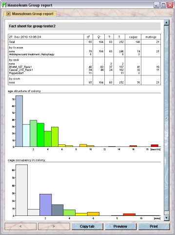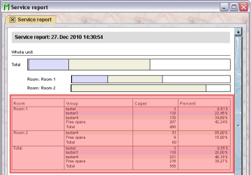 You will get a report for the service unit with tables containing information about the number of cages per group and a graphical representation of these numbers first for the whole unit and details for each room and below for each room with detatils for each rack.