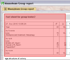 The head of the service group can also produce a report for the whole service unit. The focus of this report is a bit different compared to the reports for individual groups. In this reports the number of cages within the whole unit, each room of the service unit and the racks therein is shown for each group and in total as well as the unused space for each element. In oreder to get this report you click the Report button in the Mausoleum inspector.