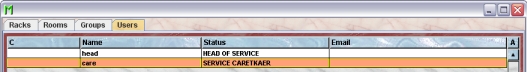 HEAD OF SERVICE: This user is the main user of the service unit. This user can create new racks and rooms and is responsible for the distribution of these objects to the groups. In addition this user can create reports for the groups and for the whole service unit.