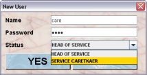 A dialog will appear in wgich you will specify the name, password and status/user role of the new user. As mentioned above in the service group there are only two different user roles: