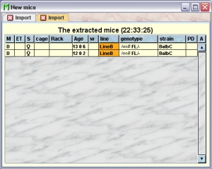 After clicking "YES" Mausoleum tries to decipher the pasted text fragment and if possible will import all the objects (mice, loci, lines and strains). If the extraction was sucessful a window is shown which contains a table with the extracted mice.