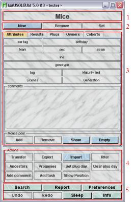 - Search: You can search mice and cages with specialized user interfaces described in the section "Search"