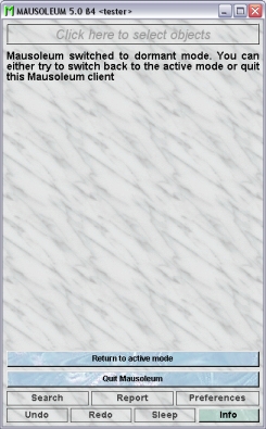 From time time to time it might be the case that client licenses are in scarce. To reduce the amount of used licenses you can set Mausoleum in the dormant mode. This means that the Client is still connected to the server and is notified upon all object modifications but it is not counted as avtively used license and on the other hand can neither display nor alter objects while it is set to the dormant mode. You easily detect a domant Mausoleum client by the contents of the inspector: