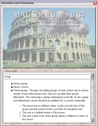 - Info: Opens a window with version information for the server and client program and the version history listing all the changes of the last program versions