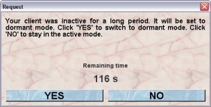 Now a countdown is started. During the remining time you have the opportunity to return to the active mode by clicking "NO". If you click on the "YES"-button or the remainig time is over, the client is set to dormant mode.
