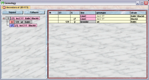 - Ancestors: This gives you a pedigree chart for each selected mouse as separate tabs in a new window. You can expand or collapse individual nodes by clicking the "+" or "-"-symbols in the tree veiw on the left side. The mouse table on the right side shows the visible mice of the tree view. You can expand or collapse the whiole tree by clicking the "Expand"- or "Collapse"-button. There is one special thing to mention about the tree view. If Mausoleum detects that a mouse has been already included in the tree it does not repeat this part of the tree. The respective tree node is marked as "Proxy" indicating that you find the "real" entry somewhere else in the tree together with all the ancestors of this mouse.