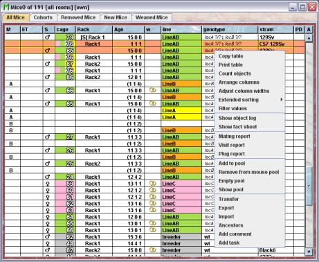The next four items of the context menu are functions for handling the Mausoleum pool of cages and mice described here. The items are: