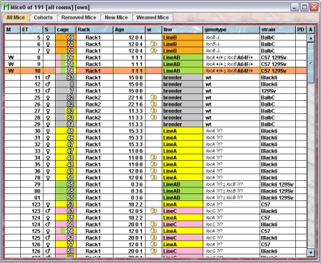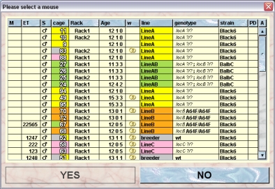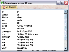 Double clicking a mouse in a mouse table will bring up the ID card which contains more specific informations about the mouse.