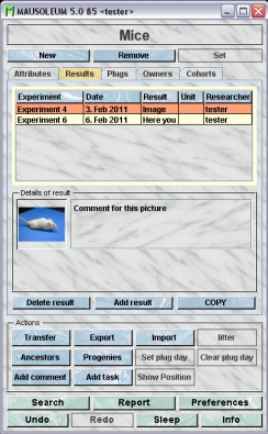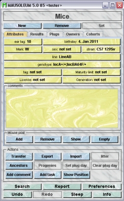This tab with all the attributes of the selected mice will always appear independent of which columns are being shown in the mouse table. The yellow buttons will change information for all selected mice, except that the comment box will work only for single mice. See below for adding comments to several mice simultaneously. The behaviour of the buttons depends on the setting for "Set mode" in the Preferences. If set to "immediate" the change is (for most of the attributes) immediately written to the database. If set to "Delayed" the changes are collected and only transmitted to the databse, when the "Set"-button is pressed. If you are using Mausoleum in this mode it is important to click the "SET" button if any of the yellow datafields turns red before leaving the tab or selecting other mice. Otherwise the data entered will be lost. Clicking "YES" in dialogs has the same function as the "SET" button.