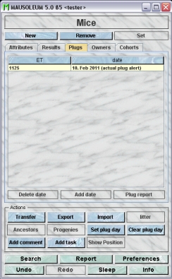 - Plug report: The plug report is defined for male mice. Males do not get plug dates, but the performance of a male can be viewed.In the report all mating opportunities with dates for successful plugging are shown.