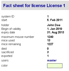 Clicking "Yes" will remove the mice from the set of the actual mice and the cage and will set the chosen end mode. You find the removed mice in the "Removed mice"-tab of the mouse window. If a license was defined for the removed mice they will be registered by their death mode as shown in this part of a fact sheet from a license where you can see the numbers of died, sacrificed and exported mice listed: