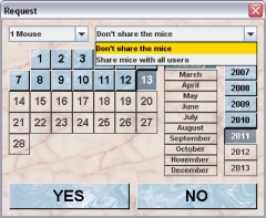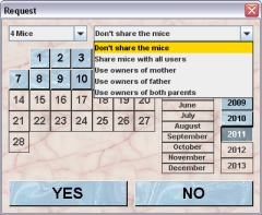 - Share mice with specific user: This will bring up a dialog in which you select the other user wiith whom you want to share selected mice. If the mouse belongs at the moment to all users you and the selected user will be the defined owners. If the selected mice already have defined users (including you) the selected user will be added to this list.