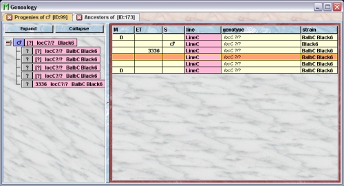 - Progenies:This gives you a tree view of all offspring from the selected mice as separate tabs in a new window. The user interface is the same as described for the Ancestors: