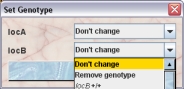 In this dialog you can set the genotype for each locus of the line independently. Fir all loci you get a selection field where you can chosse from all combinations of the alleles which are contained in the line for the given locus. For the loci where you don't want to change the genotype information you select "Don't change" in the selection field.