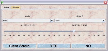 Here you can define the strain of the selected mice to be a mixture of two strains. This is useful when you are dealing with mice from a backcrossing experiment. In the two selection fields ("strain 1" and "strain 2") you select the strains and in the slider below these fields you set the ratio of mixture. The ticks of the slider are labeled with the generation markers in a backcross experiment. "F1" gives a 50/50 mixture "F2" a 75/25 mixture and so on.