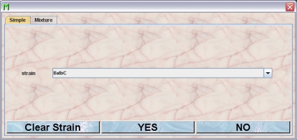 This dialog has two tabs. The tab "Simple" offers the possibility to select a strain from the set of avtive and visible strains. If you select a strain and confirm your selection by clicking "YES" the selected strain is set to 100% for all selected mice. You can also clear the strain information for the selected mice by clicking "Clear strain". If you want to specify a strain mixture for the selected mice you switch to the tab "Mixture":