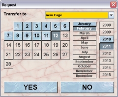 - Transfer: The selected mice can be transferred to a cage in the selction field. This functions the same way as drag and drop in the rack window. You get a dialog to specify the target cage and the date of the transfer. Please be careful with the transfer date. Functions like determination of the father or calculation of mating efficiency strongly depend on the correct dates of mosue transfers. If you select "new Cage" in the selection field a new cage is created and placed in the transfer area.