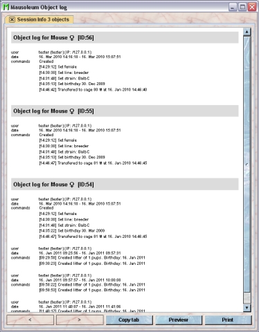 Object logs provide an easy to read representation of all the modifications of the objects in the database.You can display for all object when and by whom attributes of an object were modified. This is useful if you want to check when a specific mouse attribute e.g. the genotype was changed.