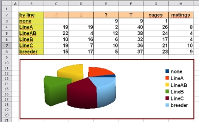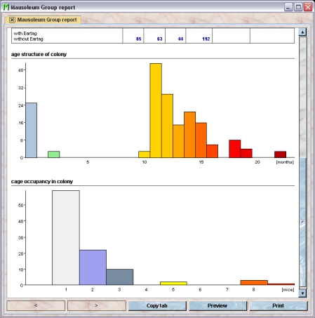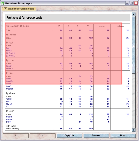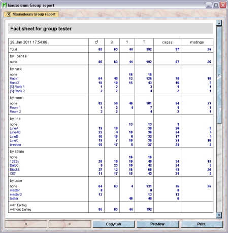 Regular users (MASTERs and GURUs) can produce detailed reports for the group. These reports show the number of mice, cages and matings listed by license, rack, room, line, starin and user. To get these report you click on the "Report"-button in the lower part of the inspector.