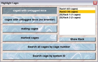 After clicking one of these buttons you will immediately see in the list to the right in which racks cages matching the criteria can be found. If you select a rack in this list you can click the buitton "Show rack". This will open the rack window with the selected rack and all the cages which match the criteria in this rack are selected.