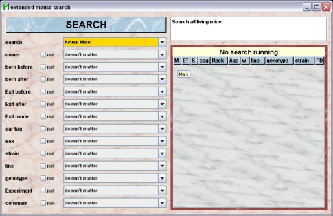 - Actual mice: Choosing this will restrict the search to the living mice of your colony. Serches for the living mice can be handled on the client machine and are therefore very fast.