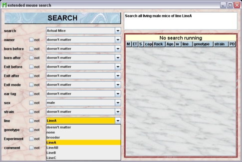 Using the other selection fields you can specify the search criteria indicated by the label on the left hand side. The simplest option on top of every list in the beginning is "doesn't matter" which means that this criteria will be ignored. Depending on the type of criteria you will get lists where the possible options are shown (see below for "line") or you can invoke a dialog where you can type in a specific value (e. g. for "born before"). The little checkbox "not" will invert the serach for this criteria. All selected criteria are checked (technically speaking) in an AND mode which means that a mouse has to satisfy all the criteria to be shown in the result table.