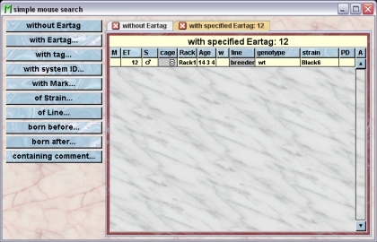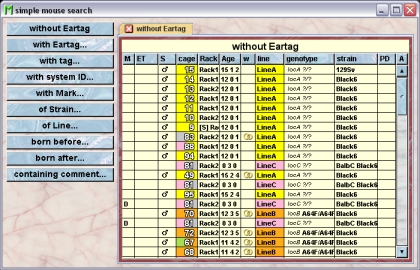 The simple mouse search offers you the possibility to find living mice within the database which match one search criteria.