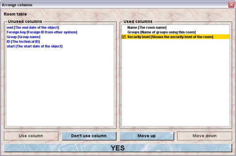 In the shown example the name of the room, the name of the groups having access to this room and the security level (with colour coding) will be shown in the room table.