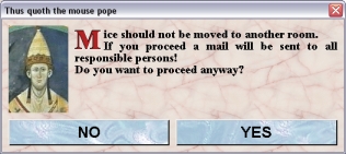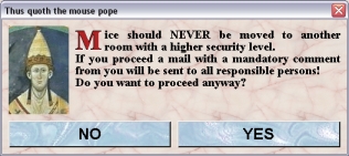 Mouse transfers between rooms with a defined security level are not recommended. If you want to transfer mice from one room with a defined security level to another room which also has a defined security level you will get informed by the mouse pope that you shouldnt do that. If the security level of the target room is lower or equal to the security level of the source room you will get this alert