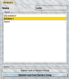 You first select the group in the group table. Then the racks of this group are listed in the group inspector. After selecting a rack which is already part of the service group (indicated by the [S] prefix) in the Racks field of the group inspector you will notice that the button Remove rack from Service Group becomes active.