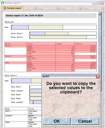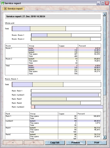 You will get a report for the service unit with tables containing information about the number of cages per group and a graphical representation of these numbers first for the whole unit and details for each room and below for each room with detatils for each rack.