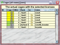 In this tab you see a table with the cages which contain mice which belong to one of the selected licenses.