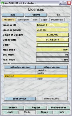 - Users: In this table you see all users of this group listed who potentially could assign mice to this license. Potential users are GURUs, MASTERs and CARETAKERs. GURUs and CARETAKERs can always register every mouse to a license For MASTERs the access to the selected licenses can be granted or refused using the buttons "grant access" and "refuse access".
