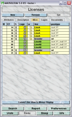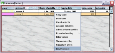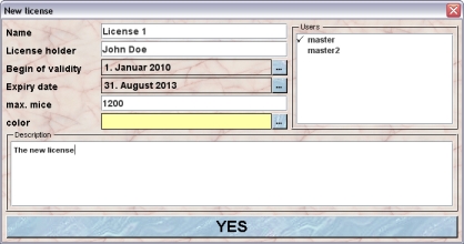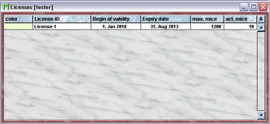 The licenses represent legal licenses which allow to keep and to work with a specified number of mice. Mice can be assigned to a valid license and you will always keep track how much of the license is used up and how many mice can still be used in your lab.