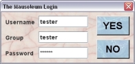 Log onto the database indicating user name, group and password. All items are case sensitive. You may store "Username" and "Group" in Preferences such that they are the default for a particular computer.