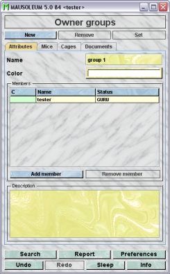 In the middle section of this tab you find a table which shows the current members of the select owner group. The GURU can add new members by clicking "Add member". In a dialog the possible candidates are presented. The candidates are the actual users of the group who can own mice and are not member of the selected owner group already. The GURU can remove members by selecting a user in the member table and clicking the button "Remove member".