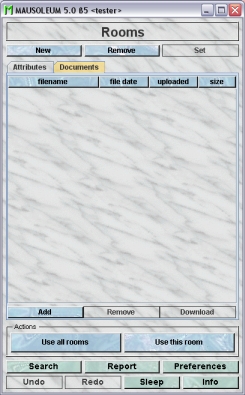 This tab lets you store and exchange documents like pdf- or Word-files with additional informations about the rooms of your group. In this tab you will find a list with the document which have been uploaded to the server.