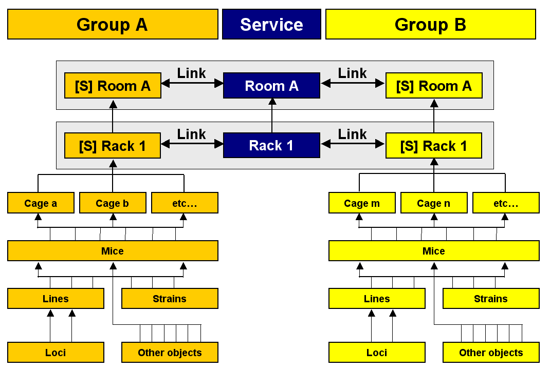 You see that that both groups have an object for the rack and the room. Because they want to share this rack, it is also defined in the service group. In addition there is a established between the racks what makes it possible to bring together the necessary data. What is in these racks is not contained in the service group. All the cages, mice, lines, strains etc. is private property of the groups. For the service group the only important thing is that it can correlate the information contained in the group’s data with its rack and room objects. After a rack is under control of the service group its attributes (like name or the room where it is located) cannot be altered. It also cannot be deleted from the group’s guru. All that is possible only for a user with the role HEAD OF SERVICE in the service group.